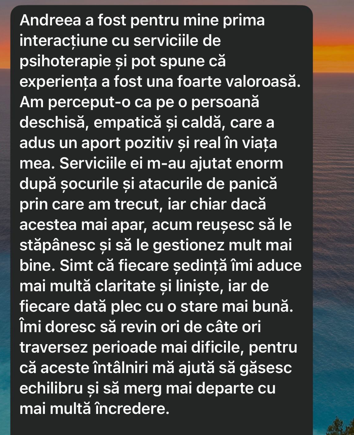 Omul Andreea și-a dorit întotdeauna să călătorească, iar psihoterapia îmi oferă acest dar de a fi copilot în călătoria prin viață a oamenilor.